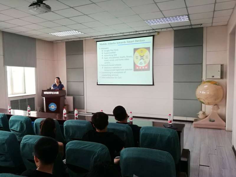 首先,科研副院长韩启龙教授向与会人员介绍李教授简历,针对学院与佐治亚州立大学在学生培养、科学研究等方面开展的合作进行了回顾和展望,并就交流内容向与会人员进行了提醒,要求双方交流要紧密围绕学术、科研开展。李教授结合其实验室目前的研究内容展开讲解,从数据隐私保护的重要性、研究背景、研究方案等方面详细的说明了当前移动设备安全保护方面的漏洞和急需解决的问题。报告环节之后,李教授同与会人员开展互动交流,与会教师同学踊跃提问,李教授均一一耐心回答,本次学术报告使我院师生及时了解到国际最新研究动态,对开展科研工作起到积极的促进作用。