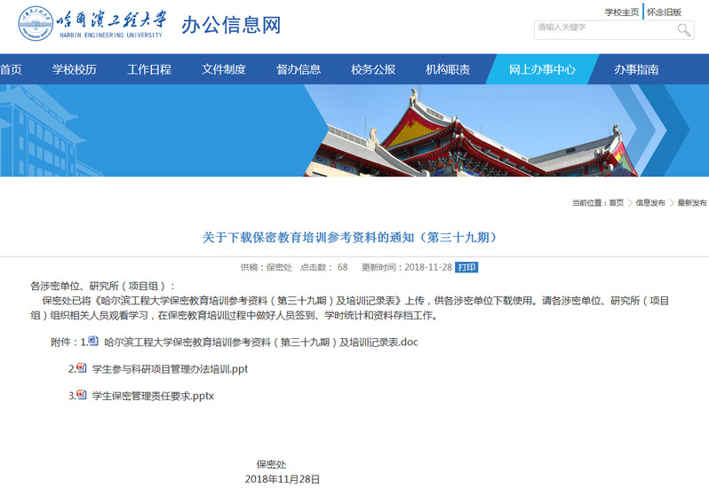 本次材料为保密处发布的第三十九期培训材料,各课题组可参照组织相关人员进行培训,本次培训计2学时。http://camel.hrbeu.edu.cn/2018/1128/c1233a207586/page.htm,并请各课题组负责人组织本组人员按照文件要求,对相关学生进行梳理,准确确定学生身份,相关表格在保密处下载专区下载。