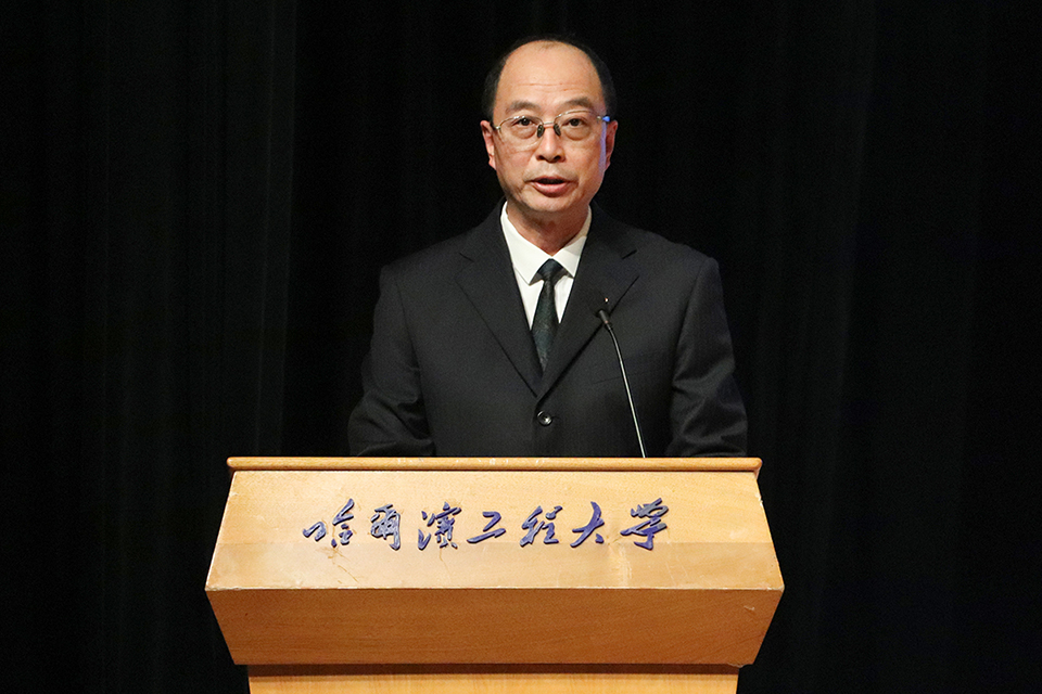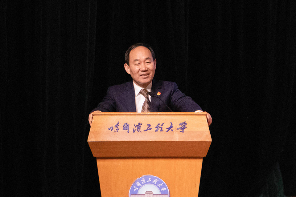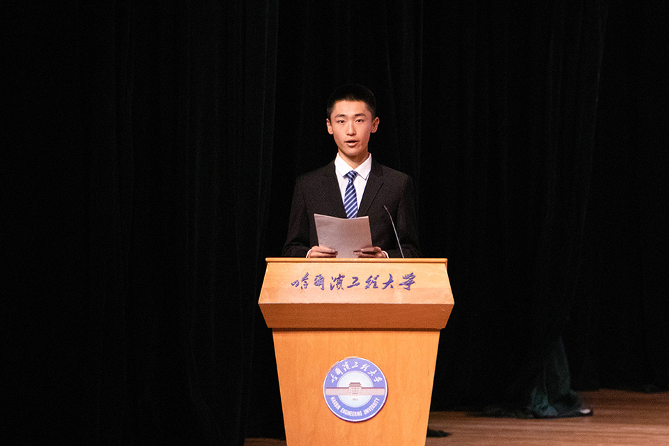 随后,张志俭副校长为学生代表佩戴校徽,哈尔滨工程大学校徽反映了学校的办学特色,美观大方、庄重高雅更象征着我们一生永不磨灭的军工精神和工程学子身份,每一位同学从戴校徽那一刻起,便要终身牢记“大工至善、大学至真”校训,在接下来的人生征途不忘初心,牢记使命,努力成为又红又专,可靠顶用的社会主义建设者和接班人