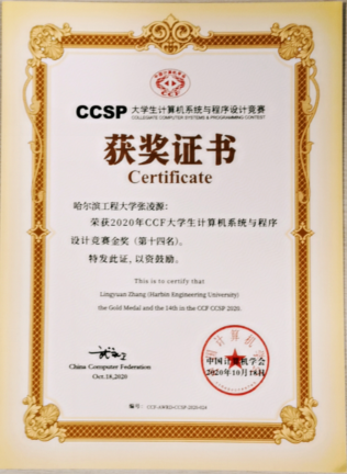 2020 CCF大学生计算机系统与程序设计竞赛(CCSP)于10月17日在全国的64所CSP认证点高校举办,来自全国67所高校的1016名选手参赛。我校成绩全国排名第十,在工信部七所学校中排名第一。其中张凌源同学获得个人东北区第一,全国第十四的好成绩。