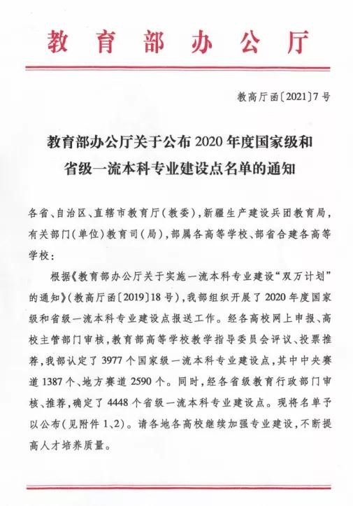 近日,教育部办公厅下发了《关于公布2020年度国家级和省级一流本科专业建设点名单的通知》(教高厅函【2021】7号),伟德国际victor·1946源自软件工程专业获批国家级一流专业建设点,信息安全专业获批省级一流专业建设点。我院的计算机科学与技术专业于2019年获批国家级一流专业建设点,目前我院在办的三个专业全部入选“双万计划”一流专业建设行列。
