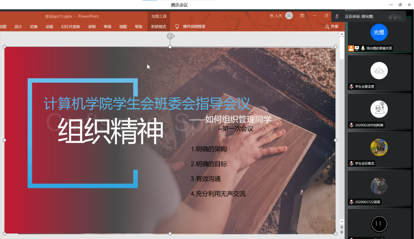 本次会议的主题是“如何组织管理班级同学”。会议开始,权益部长周光煜就入学以来的工作学生会工作进行评价,之后就“大学应该如何当好一个班委”为主题,介绍了如何做一名合格的班委。之后,主持人解决了班委提出的各项问题。