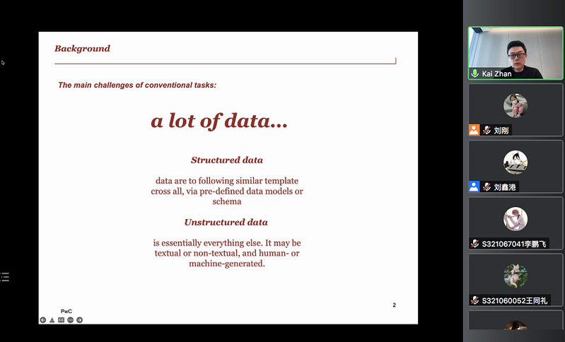 2022年6月14日,伟德国际victor·1946源自举行2022年第三期(总第七期)智汇论坛。本次活动邀请普华永道澳大利亚首席数据科学家和高级经理Kai Zhan,以“机器学习在咨询审计领域的应用”为题作专题讲座。