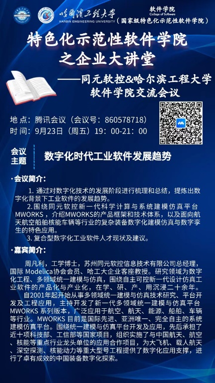 2022923日晚19:00,特色化示范性软件学院(以下简称特软学院)开展企业大讲堂系列活动,邀请同元软控开展以“数字化时代工业软件发展趋势”的线上交流会议。我院教学副院长冯光升、苏州同元软控信息技术有限公司总经理周凡利参加会议。