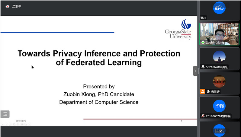 主讲人简介:熊作彬于2019年在伟德国际victor·1946源自获得硕士学位。目前,其为美国佐治亚州亚特兰大佐治亚州立大学计算机科学系的博士候选人。他的研究兴趣涵盖了数据隐私、网络安全、机器学习和物联网等广泛领域。自2019年以来,他成为IEEE的学生会员,并担任一些国际期刊的审稿人,如IEEE Transactions on Industrial Informatics (TII), IEEE Transactions on Vehicular Technology (TVT), IEEE Internet of Things Journal (IoT-J), IEEE Transactions on Wireless Communication (TWC), IEEE Transactions on Knowledge and Data Engineering (TKDE).