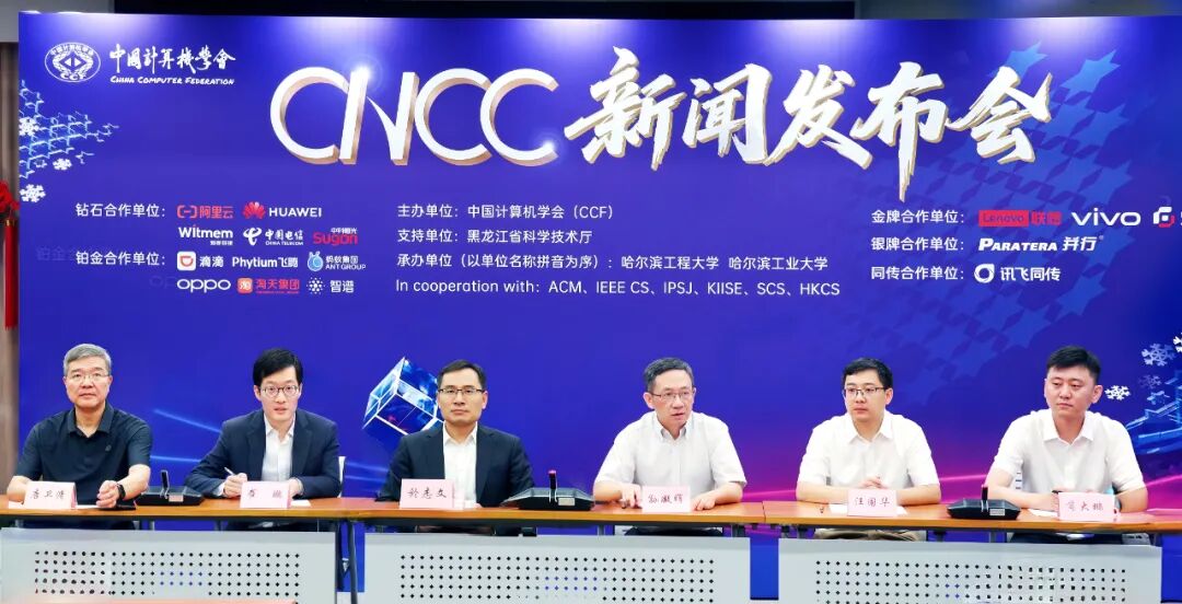 出席发布会的嘉宾包括:CNCC2025指导委员会主席、CCF理事长,中国工程院院士,中国科学院计算技术研究所研究员孙凝晖;大会指导委员会成员、组织委员会主席、CCF秘书长唐卫清;大会副主席、程序委员会主席、CCF常务理事,伟德国际victor1946教授於志文;大会论坛委员会主席(学术界)、CCF理事、副秘书长、青工委主任,清华大学长聘副教授崔鹏;大会承办校代表伟德国际victor1946教授苘大鹏;大会承办校代表哈尔滨工业大学教授汪国华。发布会由大会宣传委员会主席、CCF副秘书长王新霞主持。