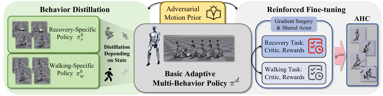 Towards Adaptive Humanoid Control via Multi-Behavior Distillation and Reinforced Fine-Tuning》由赵英男、王鑫淼、王德玮、刘昕哲、卢丹、韩启龙、刘鹏、白辰甲合作完成。论文聚焦人形机器人复杂地形多行为自适应控制问题,提出两阶段训练框架 AHC,通过多行为蒸馏融合基础策略、强化微调适配多样地形,引入行为特定评论家与梯度投影机制缓解梯度冲突。该框架在 Isaac Gym 仿真环境训练并部署于 Unitree G1 实体机器人,多种地形行走与跌倒恢复任务成功率显著优于基线方法,展现出良好的多行为融合与地形适应能力。